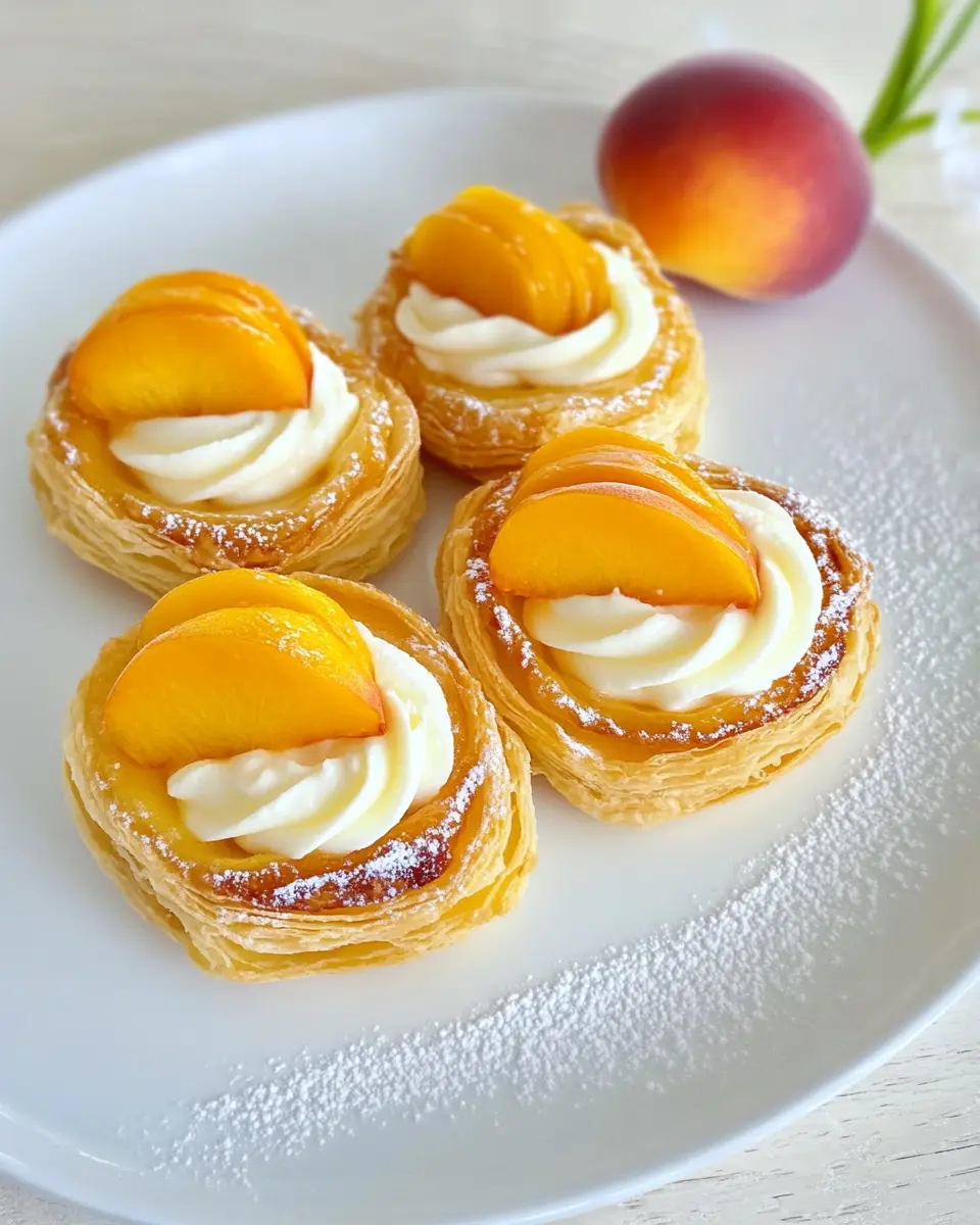 Ein köstliches Dessert aus Blätterteig, gefüllt mit Zitronencreme und frischen Pfirsichen.